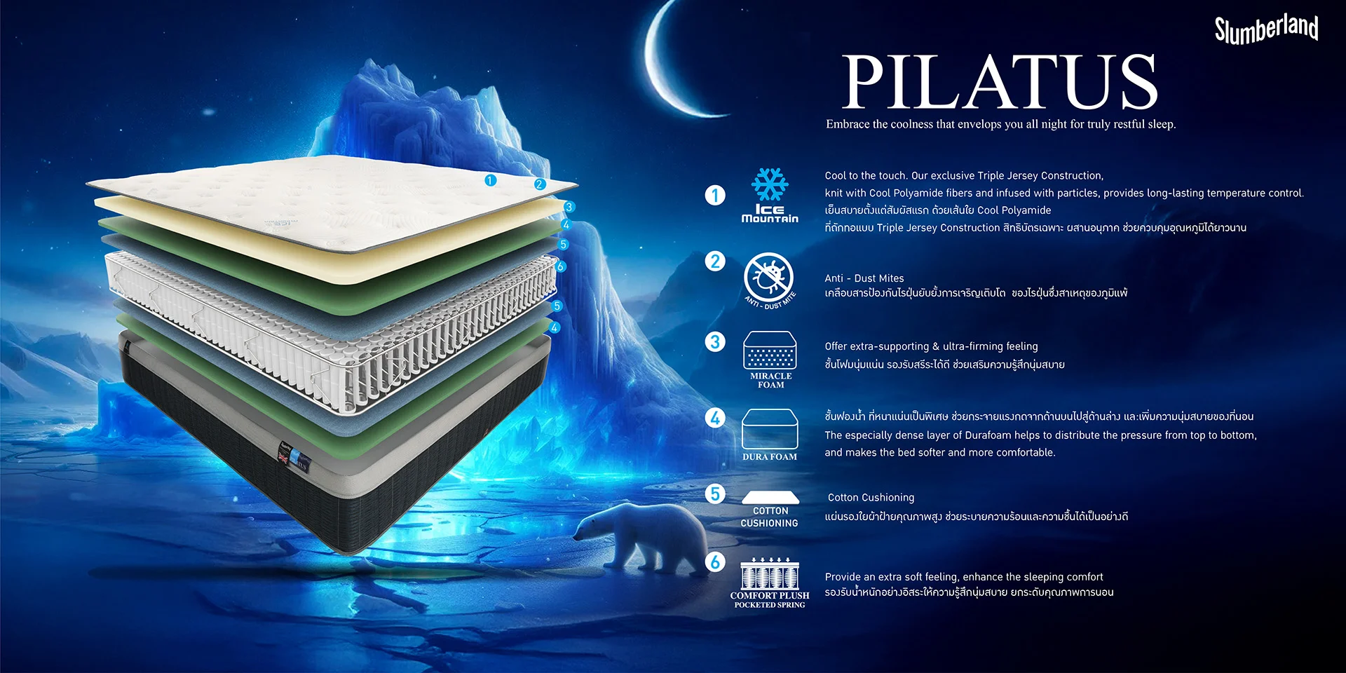 Experience cool comfort the moment you lie down on the Slumberland PILATUS mattress. It features Ice Mountain fabric technology, a cover woven with Cool Polyamide fibers in a proprietary Triple Jersey Construction. This high-quality weaving process uses three types of fibers to enhance the fabric's performance, along with particles that help reduce and control temperature throughout your sleep.