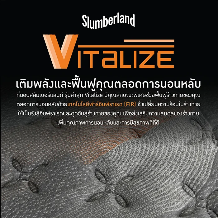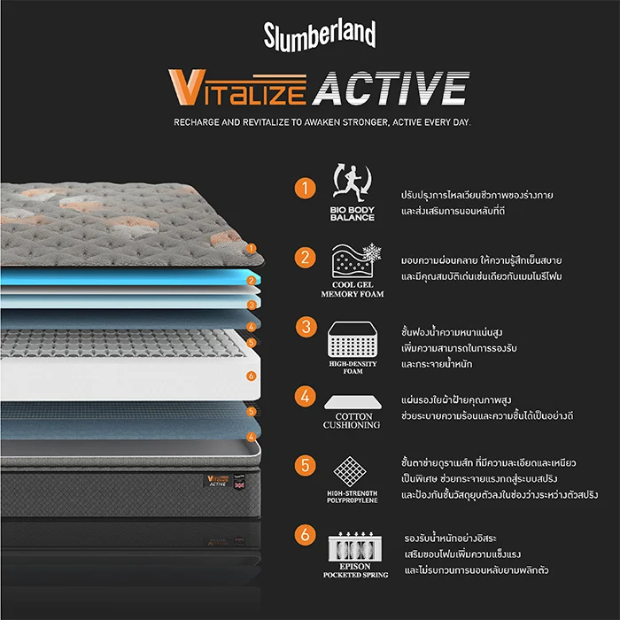 The Slumberland Vitalize Active mattress is designed to recharge and revitalize your body throughout the night. Built on the Vitalize concept, it helps promote relaxation, balance, and refreshed awakening every morning.