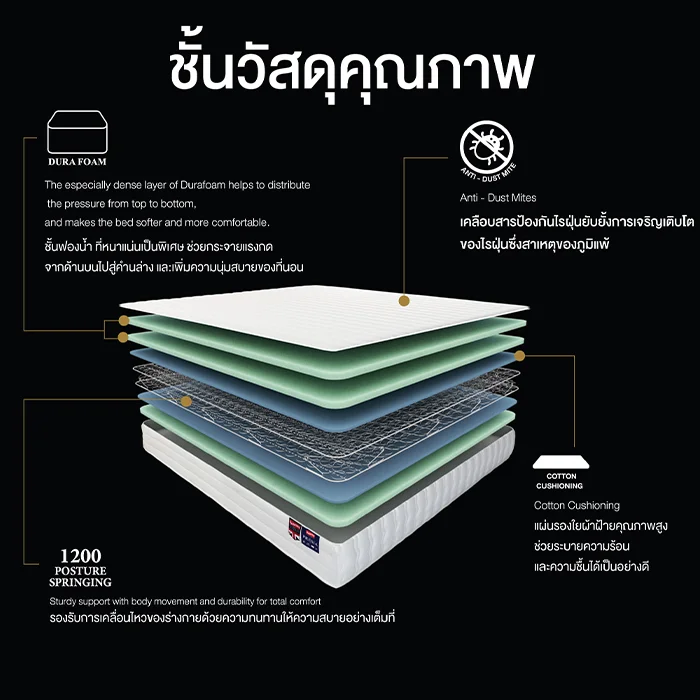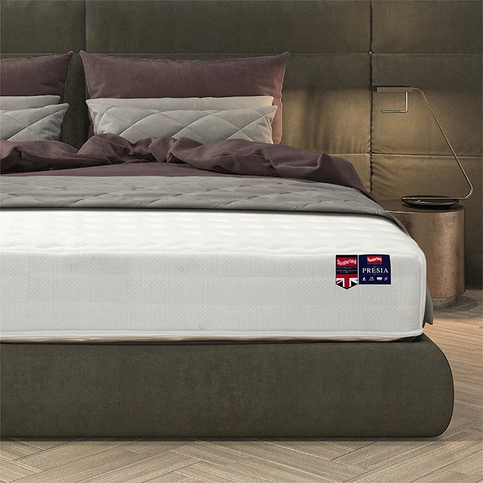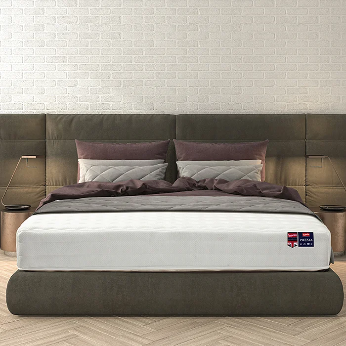 ที่นอนสลัมเบอร์แลนด์ รุ่น Presia มอบสัมผัสที่นุ่มนวล ให้ความรู้สึกสะอาดและสบายยามนอนหลับ รองรับทุกส่วนของร่างกายได้อย่างสมบูรณ์ พร้อมด้วยระบบสปริง 1200 ที่เป็นเอกสิทธิ์เฉพาะของสลัมเบอร์แลนด์ ช่วยรักษาสมดุลในการรองรับน้ำหนักของการเคลื่อนไหวร่างกายคุณ ใช้ผ้าทอลายคุณภาพนำเข้าจากต่างประเทศมีป้องกันไรฝุ่นและเชื้อรา ที่นอน รุ่น Presia ให้คุณนอนหลับสบายตลอดคืน