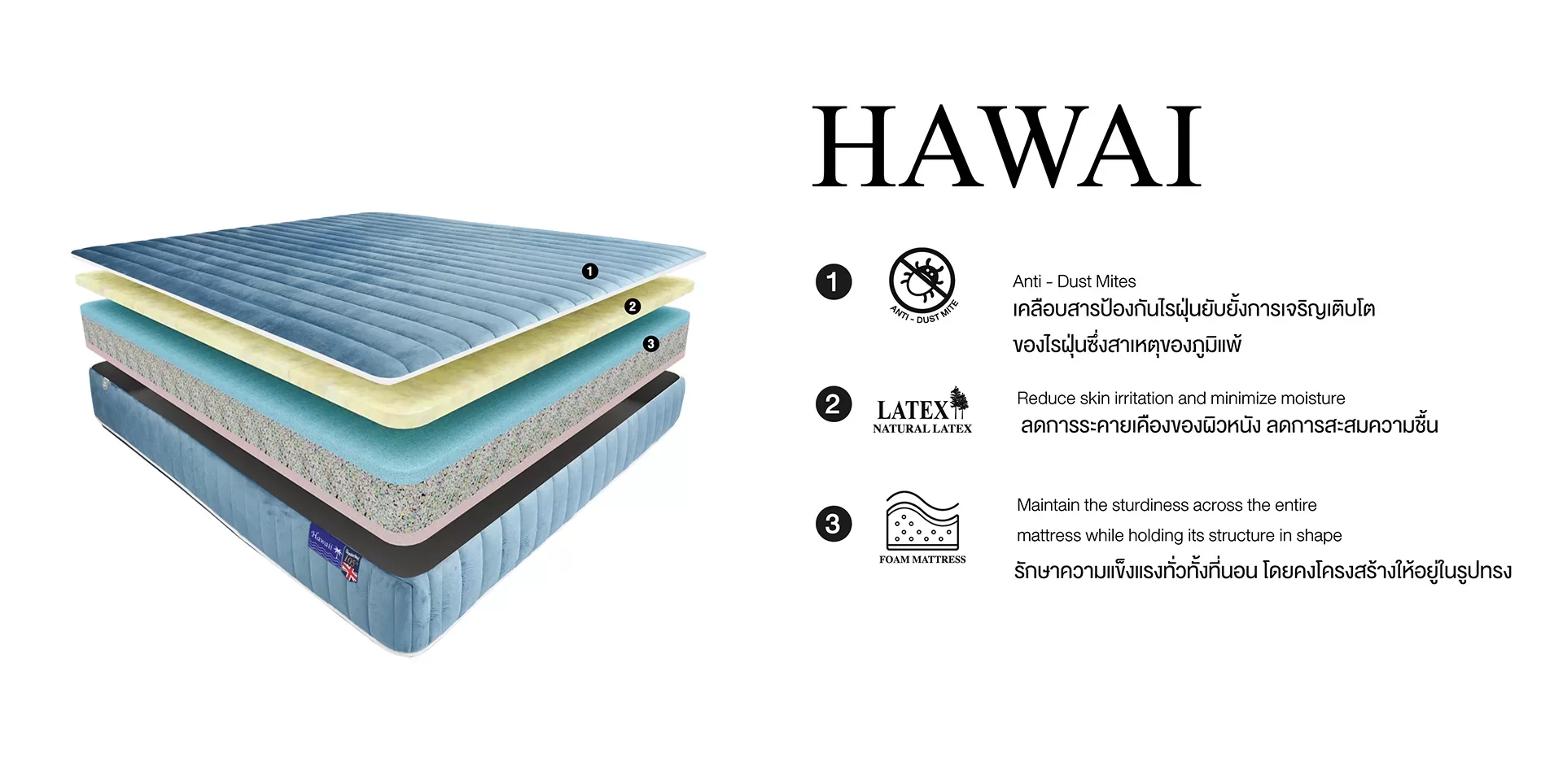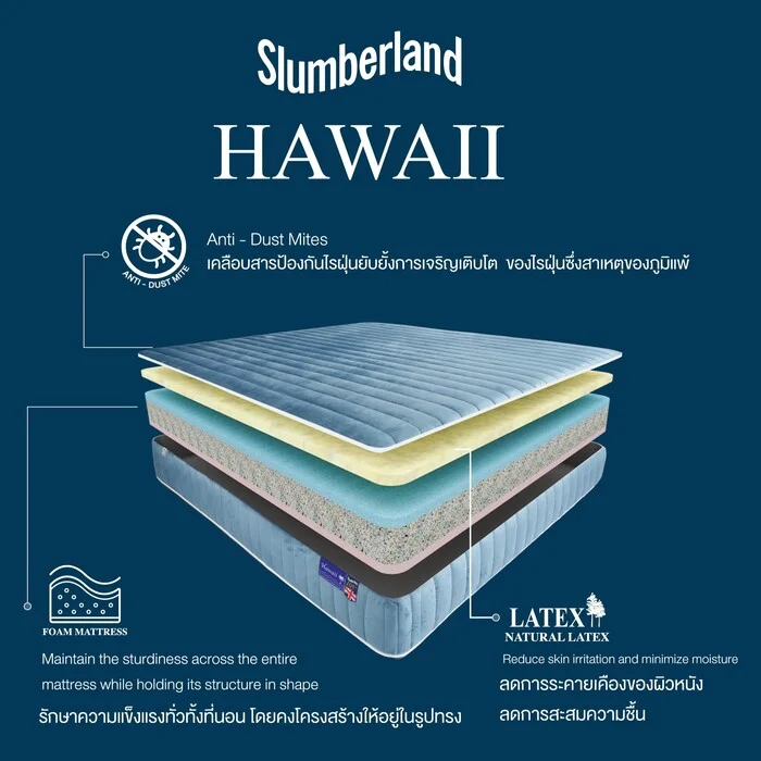 ที่นอน Slumberland รุ่น Hawaii ได้รับการพัฒนาเพื่อรองรับสรีระได้ทุกท่วงท่าการนอนของคุณ ในแบบโซนนิ่ง (zoning) ให้ความยืดหยุ่นรองรับในเวลานอน และกระจายน้ำหนักได้ดี ในช่วงบ่า หลังและสะโพก ใช้ผ้าหุ้มชั้นนอกนำเข้าจากต่างประเทศ ให้สัมผัสที่นุ่มสบาย และมีคุณสมบัติป้องกันไรฝุ่น และยังใช้งานได้ทั้งสองด้าน ด้านหนึ่ง - ความรู้สึกสบายจากชั้นยางพาราธรรมชาติแท้ หรืออีกด้าน -ความรู้สึกแน่นนุ่ม ให้คุณจะได้นอนหลับสบายอย่างที่ปรารถนา