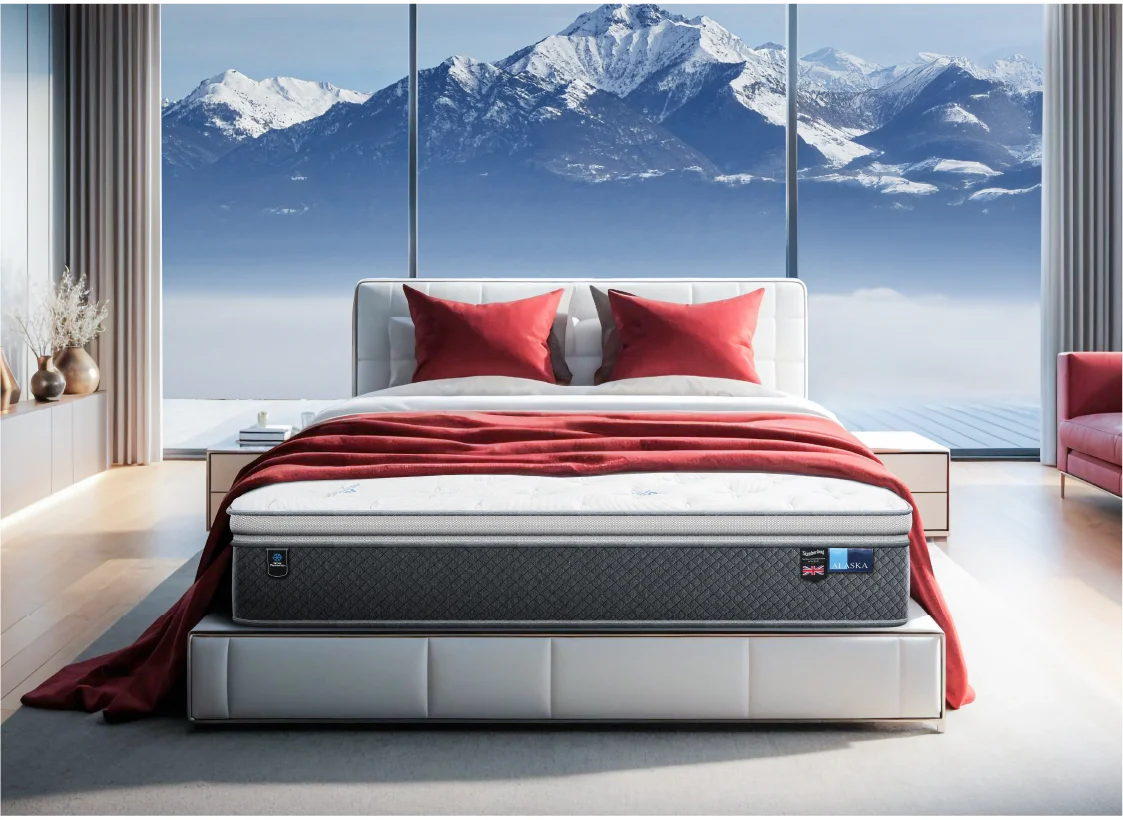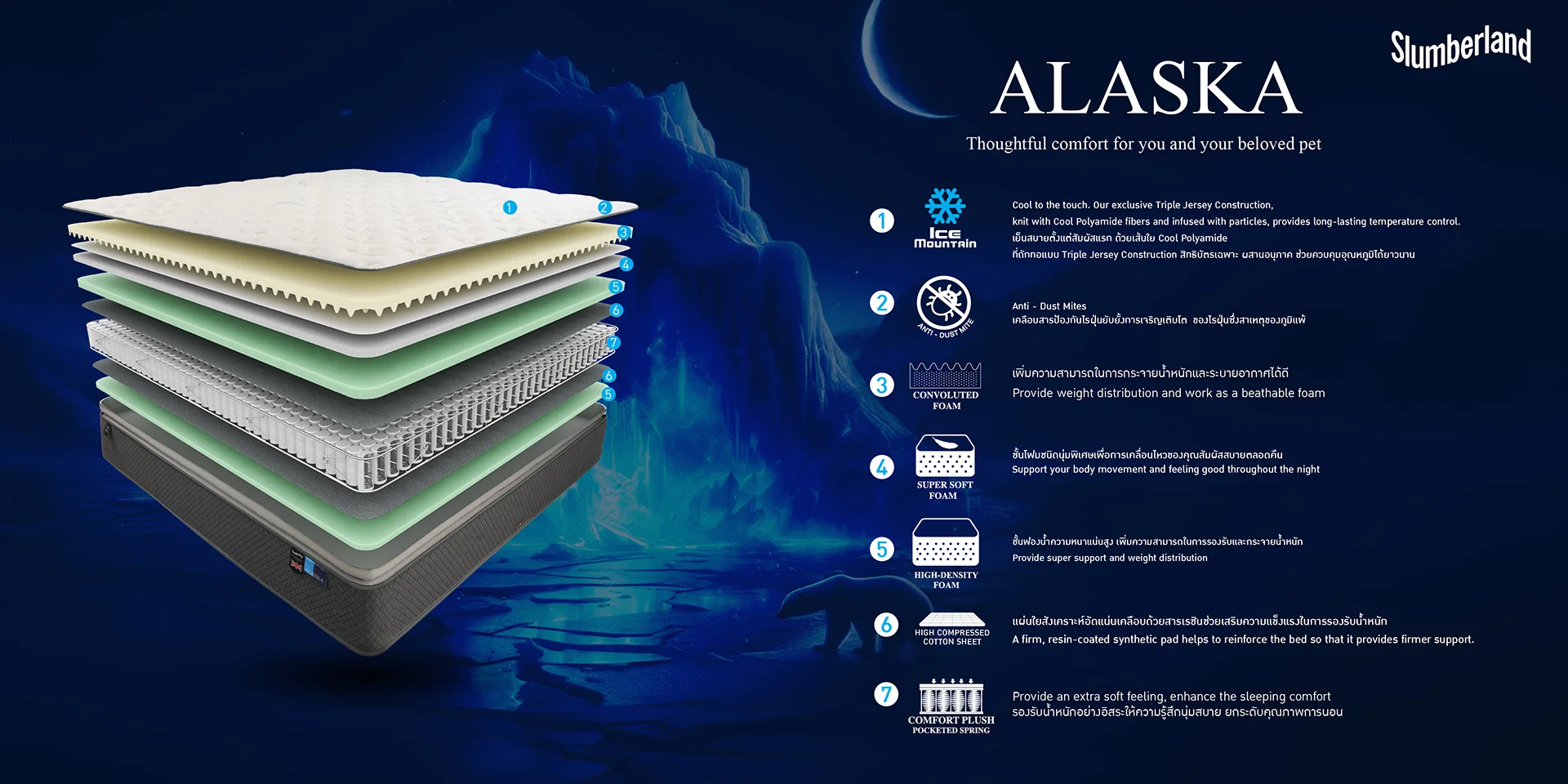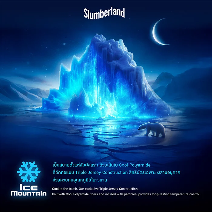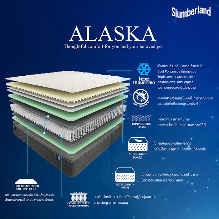 ที่นอน Slumberland รุ่น ALASKA ให้คุณสัมผัสถึงความเย็นสบายตั้งแต่เอนกายลงนอน ด้วยเทคโนโลยีผ้า Ice Mountain ผ้าหุ้มที่มีส่วนประกอบของเส้นใย Cool Polyamide ที่ถักทอแบบ Triple Jersey Construction สิทธิบัตรเฉพาะ ซึ่งเป็นกระบวนการถักทอคุณภาพสูง ด้วยเส้นใย 3 ชนิด ซึ่งช่วยเพิ่มประสิทธิภาพของผ้าหุ้มที่นอน ผสานอนุภาค ช่วยลดและควบคุมอุณหภูมิได้อย่างยาวนานตลอดการนอนหลับของคุณ