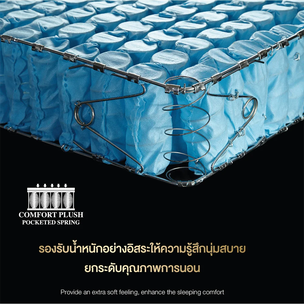 - โครงสร้าง Comfort Plush Pocketed Spring รองรับน้ำหนักอย่างอิสระให้ความรู้สึกนุ่มสบาย