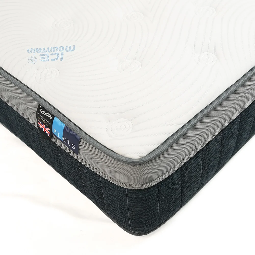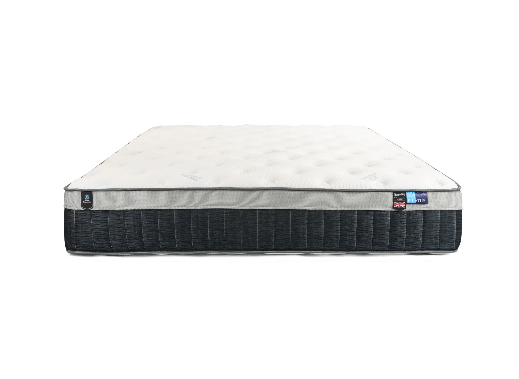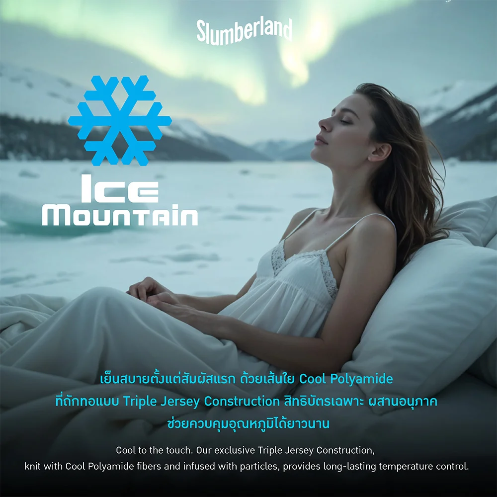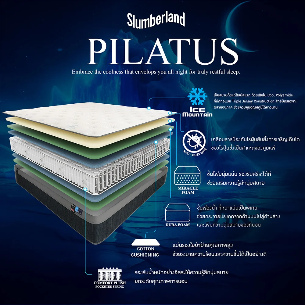 ที่นอน Slumberland รุ่น PILATUS ให้คุณสัมผัสถึงความเย็นสบายตั้งแต่เอนกายลงนอน ด้วยเทคโนโลยีผ้า Ice Mountain ผ้าหุ้มที่มีส่วนประกอบของเส้นใย Cool Polyamide ที่ถักทอแบบ Triple Jersey Construction สิทธิบัตรเฉพาะ ซึ่งเป็นกระบวนการถักทอคุณภาพสูง ด้วยเส้นใย 3 ชนิด ซึ่งช่วยเพิ่มประสิทธิภาพของผ้าหุ้มที่นอน ผสานอนุภาค ช่วยลดและควบคุมอุณหภูมิได้อย่างยาวนานตลอดการนอนหลับของคุณ