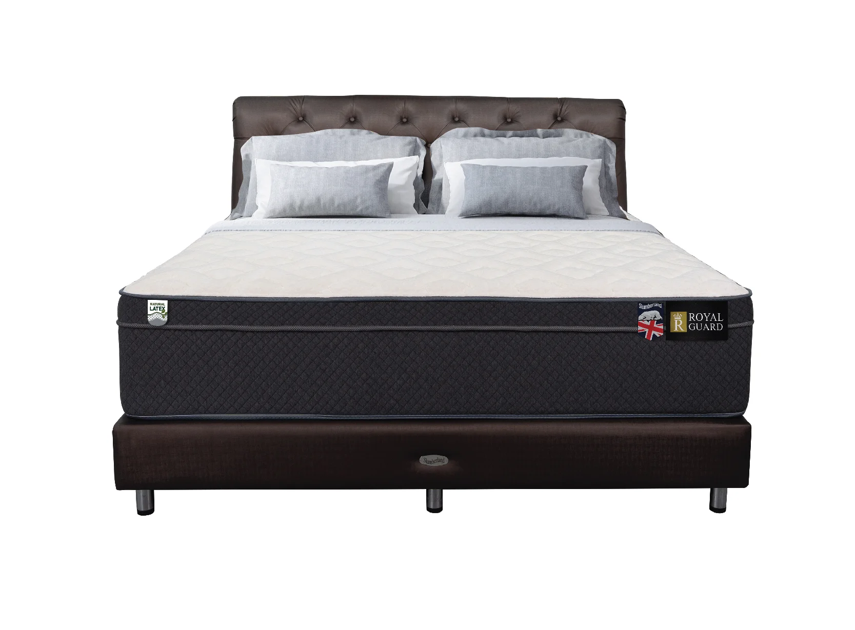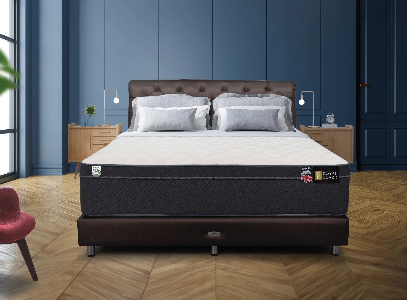 Slumberland Royal Guard สะท้อนความหรูหราและมอบความสบายในยามพักผ่อนให้คุณ เพิ่มความนุ่มสบายด้วยผ้ากำมะหยี่เนื้อละเอียดนำเข้าคุณภาพเยี่ยมจากเบลเยี่ยม ระบบ 1500 Pocketed Posture Springing การรองรับที่จัดแยกการเคลื่อนไหวของร่างกายด้วยความทนทานสร้างความสบายอย่างเต็มที่ เสริมด้วยชั้นยางพาราธรรมชาติ คุณภาพระดับพรีเมียม ช่วยในการรองรับน้ำหนัก ให้คุณรู้สึกสบายและผ่อนคลายในทุกช่วงเวลาพักผ่อนที่แสนพิเศษของคุณ