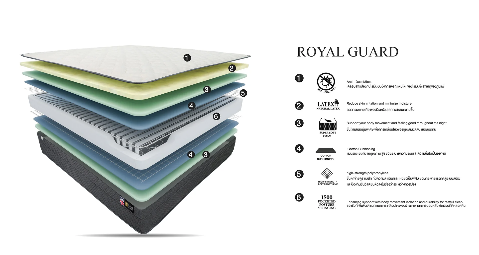 • ชั้นโฟมชนิดนุ่มพิเศษเพื่อการเคลื่อนไหวของคุณสัมผัสสบายตลอดคืน